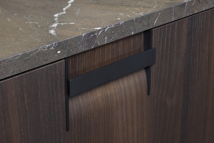 Eine davon ist die hier gezeigte Variante, bei der Nussbaumfront und Beschlag nahtlos ineinander übergehen. Damit wird der wohnliche Charakter der Küche umso mehr betont. Nicht zu vergessen die besondere Haptik, denn diese Grifflösung ist nicht nur sehr elegant, sondern auch ein echter Handschmeichler, den man sehr gerne berührt.